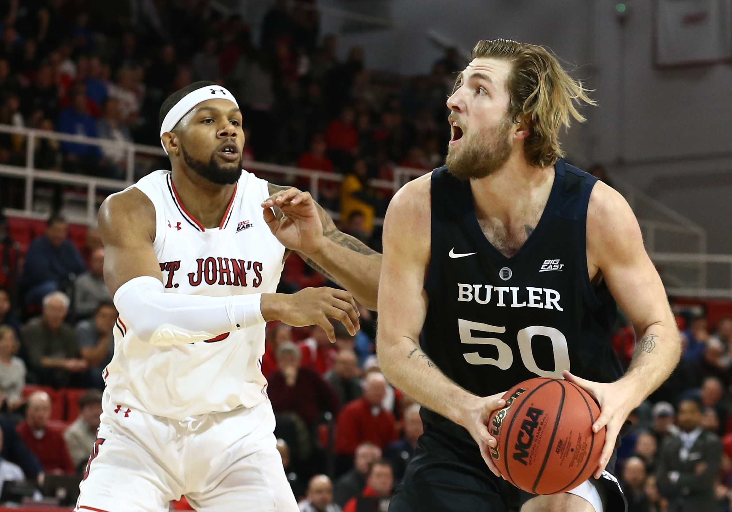 Feb 12, 2019; Queens, NY, USA; St. John's Red Storm forward Marvin Clark II (13) defends against Butler Bulldogs forward Joey Brunk (50) in the first half at Carnesecca Arena. Mandatory Credit: Nicole Sweet-USA TODAY Sports
