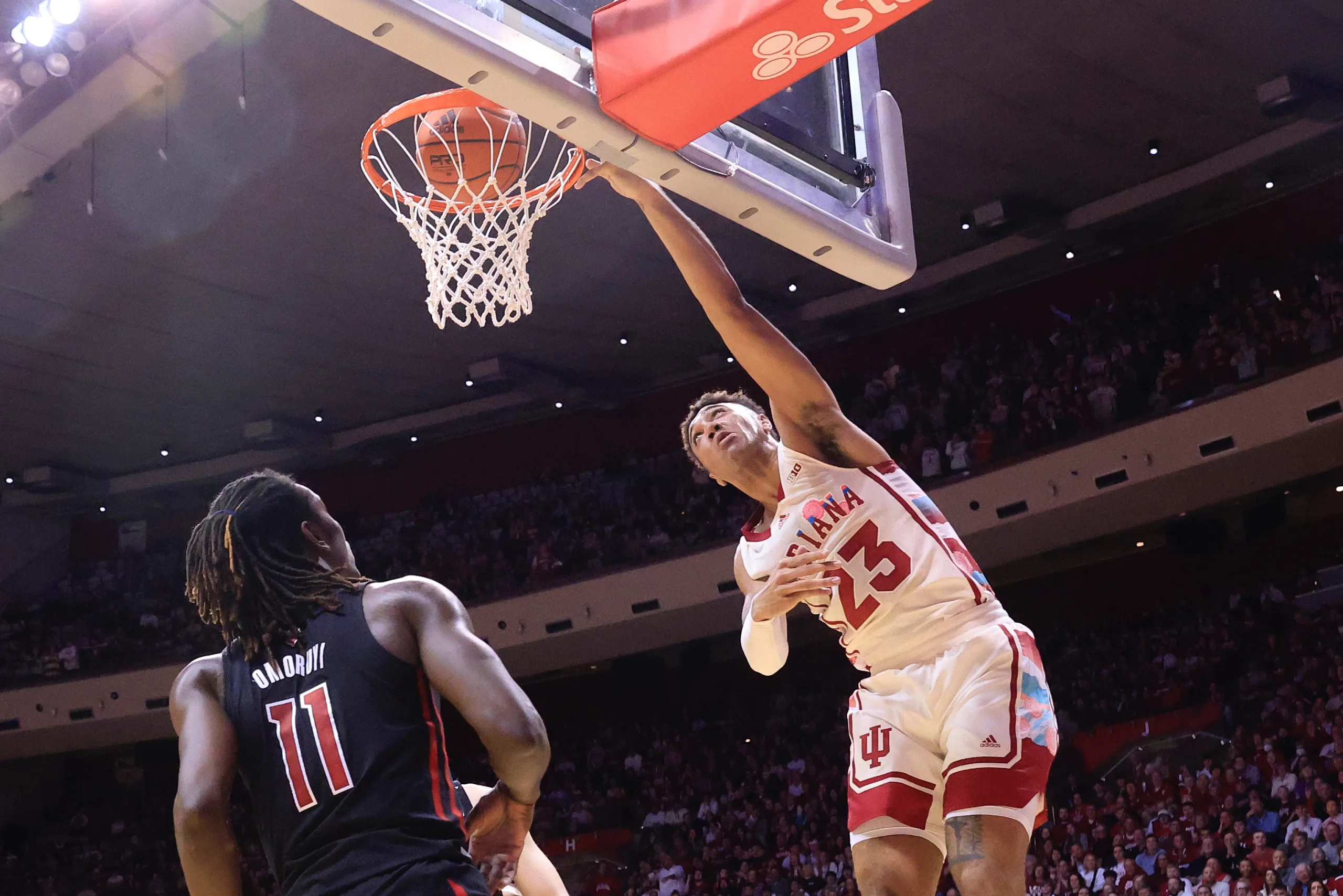 Indiana got off to a strong start, feeding off a lively Assembly Hall audience. The Hoosiers jumped out to a 30-16 advantage with 7:54 to go in the first half, and many players contributed to the cause during that stretch. In addition to Jackson-Davis and Kopp, Tamar Bates had six points of his own, Jalen Hood-Schifino scored five, including an acrobatic layup, and Malik Reneau and Trey Galloway contributed baskets.